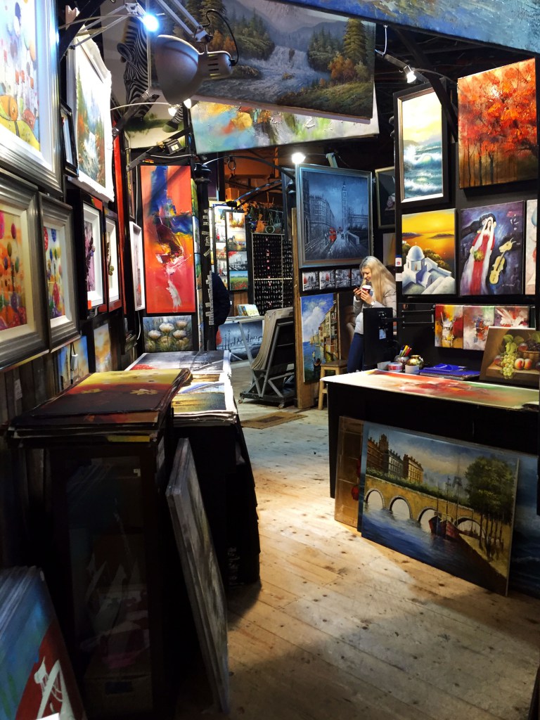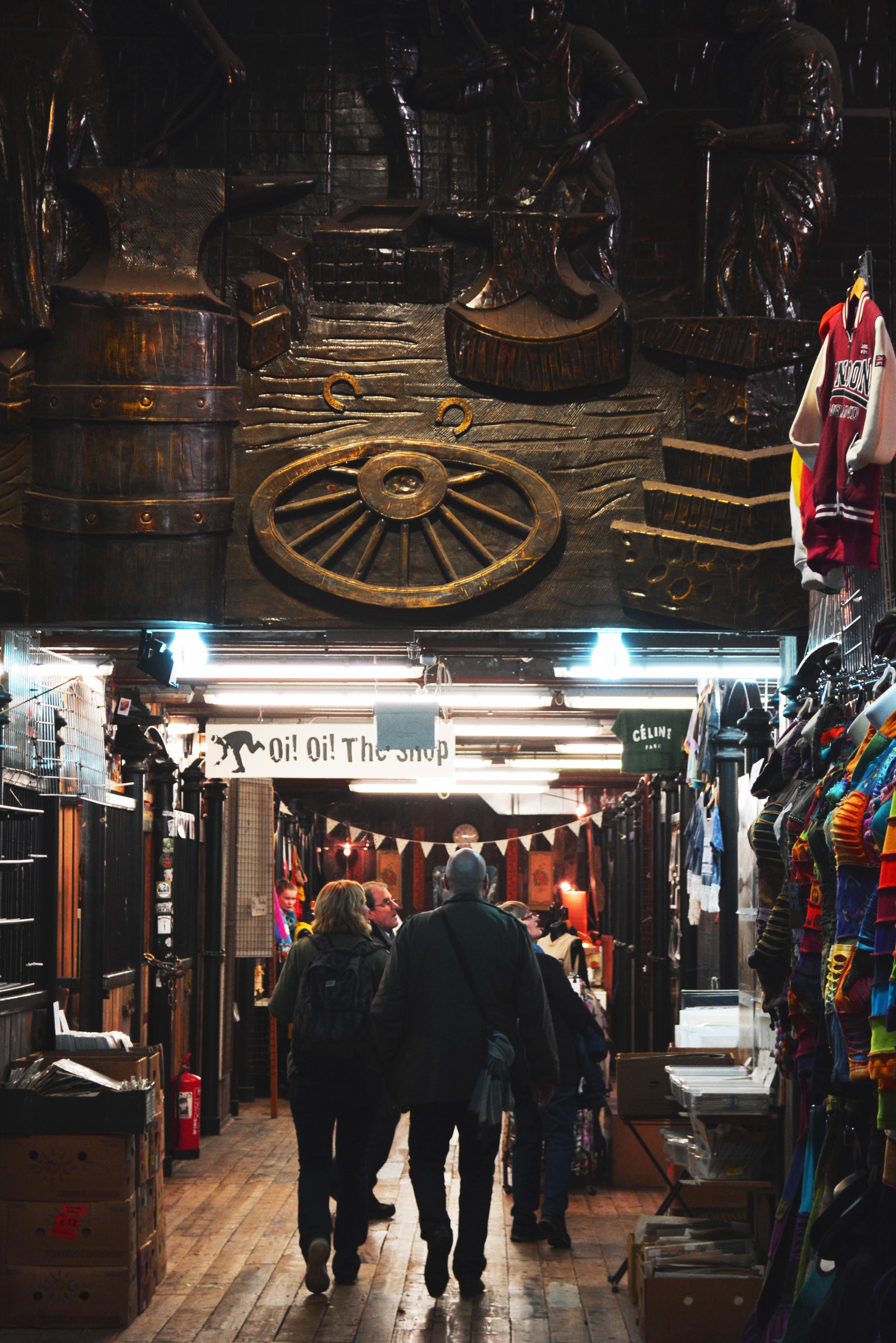 Nous parcourons à Camden Town « The Stables Market » construit sur une ancienne écurie, ici les artisans/commerçants vous présentent leurs étalages dans une ambiance un peu saloon. On sent une odeur particulière, comme si l’air portait le poids des vestiges du passé de cet endroit. Sous nos pieds, un vieux bois grinçants piétiné par les années, les stalles, si elles ne sont pas vides, accueillent désormais les commerçants à la place des chevaux.